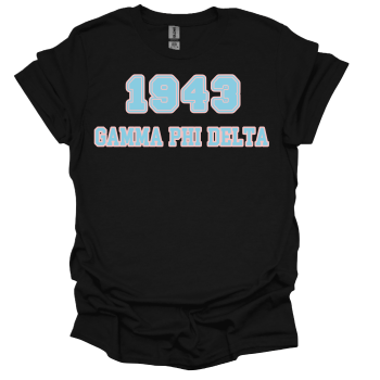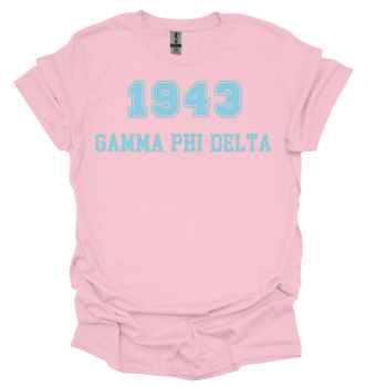 Gamma Phi Delta Sorority name and Year. This shirt is 100% cotton and available in multiple colors.