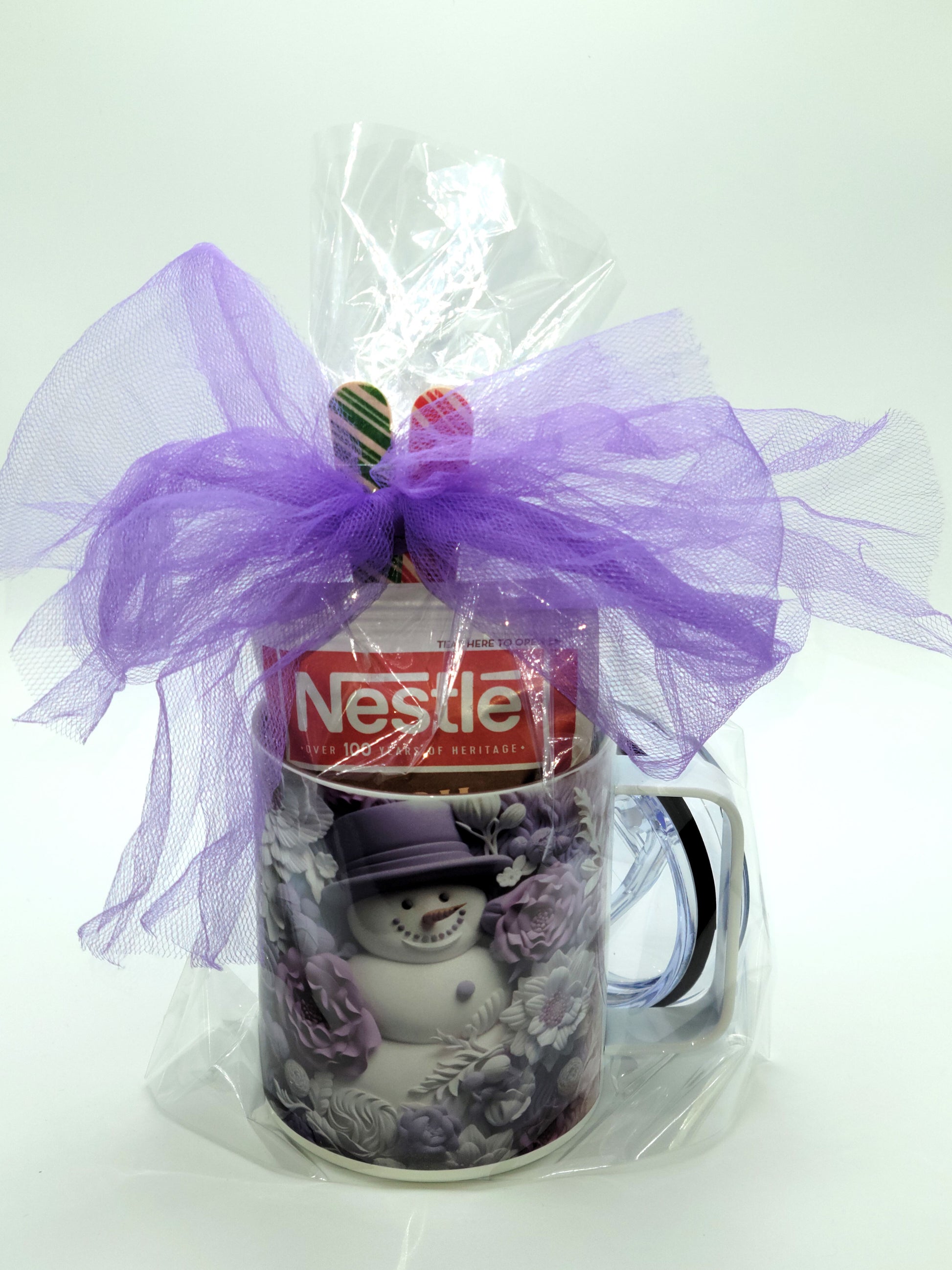 Look no further for your holiday gifts. This cute 12oz insulated mug gift set is perfect to give. This gift set comes with a 12oz insulated mug with your choice of four tea bags and four honey sticks or 2 hot chocolate packets with two holiday wooden stir spoons. The mug comes with a lid and four different style options.