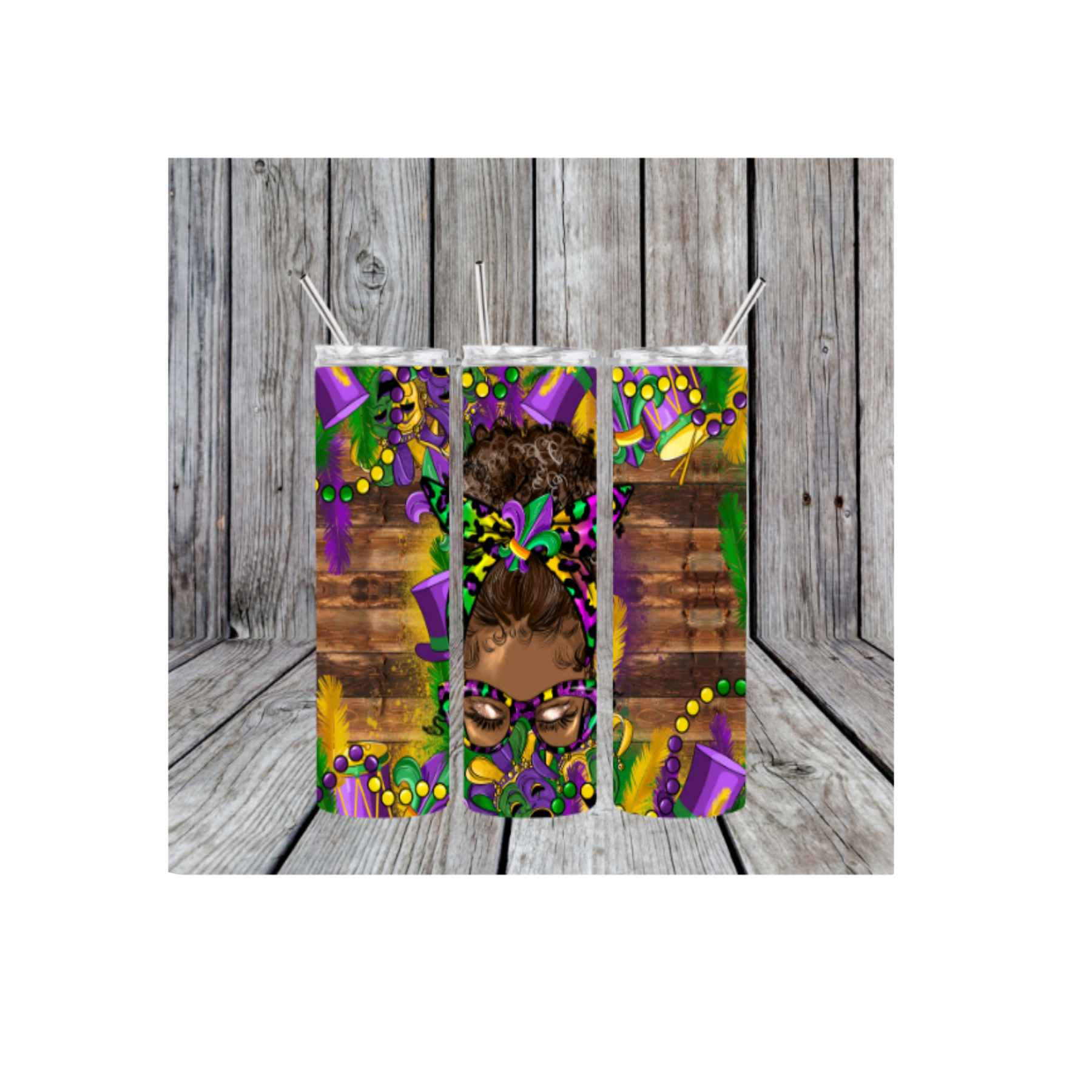 Mardi Gras Black Woman Messy Bun 20oz Skinny Tumbler (Made in the USA)