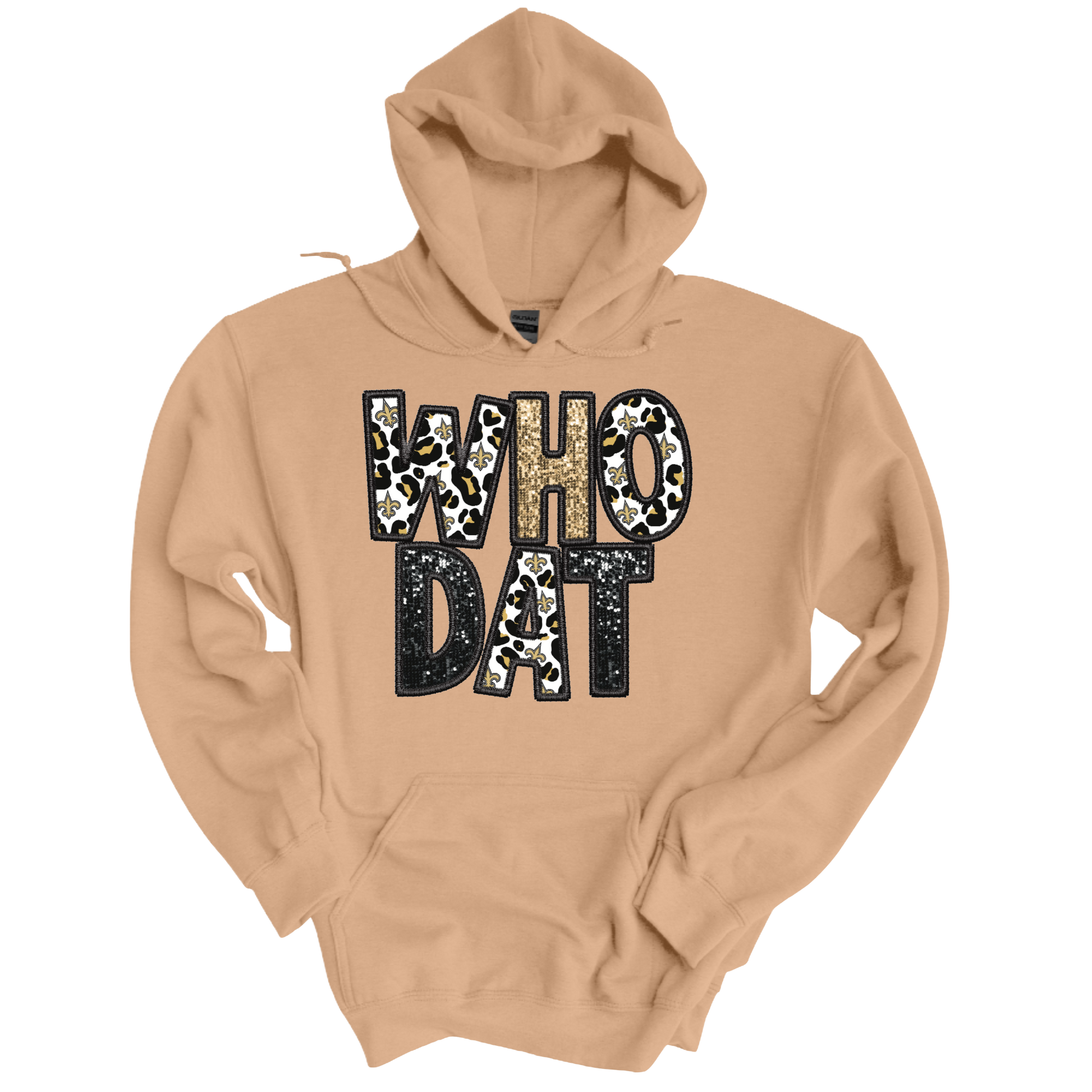 Alright Who Dat fans! Show your love with this cute faux glitter Who Dat Hoodie that is sure to keep you warm while you are tailgating or second-lining. This 100% heavy cotton hoodie is available in two colors.