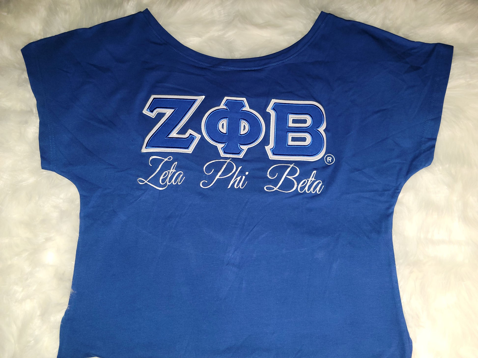 Ladies of Zeta Phi Beta, look at this beautiful high quality off the shoulder t-shirt. The letters and words are embroidered and stitched onto the shirt. The material is a very thick high-quality cotton. This shirt is a woman's fit. Only a few available.